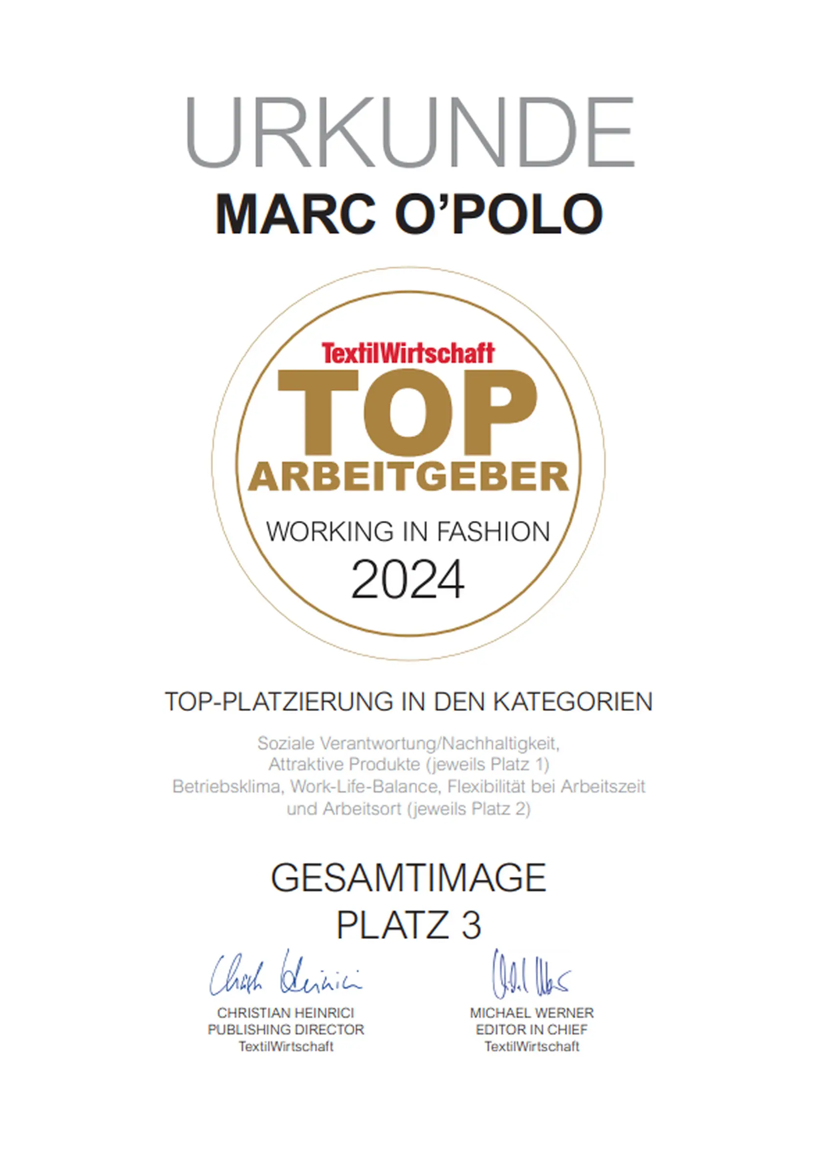 Besonders gut punktet das Unternehmen mit der Casual-Lifestyle-Brand in den Kategorien „Soziale Verantwortung“ und „Hat/verkauft attraktive Produkte“ und landet jeweils auf Rang 1. Bei den Themen „Gutes Betriebsklima“, „Gute Work-Life-Balance“ sowie „Flexibilität bei Arbeitszeit und -ort kann Marc O’Polo den 2. Platz aus dem letzten Jahr behaupten. Einen besonders großen Sprung nach Vorne macht das Unternehmen bei der Bekanntheit als Arbeitgeber und rückt von Platz 8 auf Platz 3 in diesem Jahr.