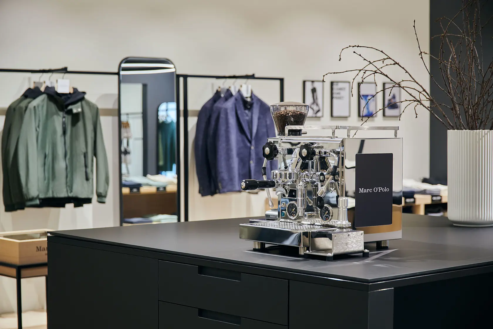 The store concept "The Scandinavian Studio" emphasises the character of the collections: Scandinavian simplicity. Clean and contemporary. Linear shapes and timeless colours, in combination with the design elements, offer a high-quality, spacious interior with a luxury approach. Open display windows, long tables, goods carriers with flexible shelves, mirrors and racks, and high-quality carpets show off the collection. The colours focus on off-white, Marc O'Polo grey and black. High-quality materials and tinted glass elements bring modernity, naturalness and lightness. Design and function are combined in the lighting concept on the ceiling and walls, which features the latest LED technology. The Coffee Concept table, with its subtle checkout and packing area, combines the pleasant with the useful.